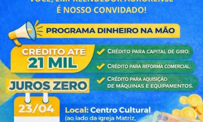 O evento está programado para acontecer às 9h, no Centro Cultural de Aurora, localizado ao lado da Igreja Matriz. A proposta é apresentar condições de financiamento destinadas a empreendedores locais interessados em investir ou ampliar suas atividades.