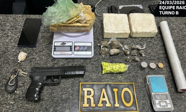 Também foram apreendidos um simulacro de arma de fogo, balanças de precisão, um aparelho celular e materiais utilizados para embalagem dos entorpecentes.