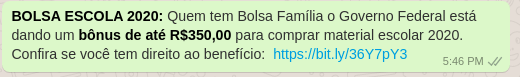 Golpe disseminado no WhatsApp promete material escolar para beneficiários do programa Bolsa Família