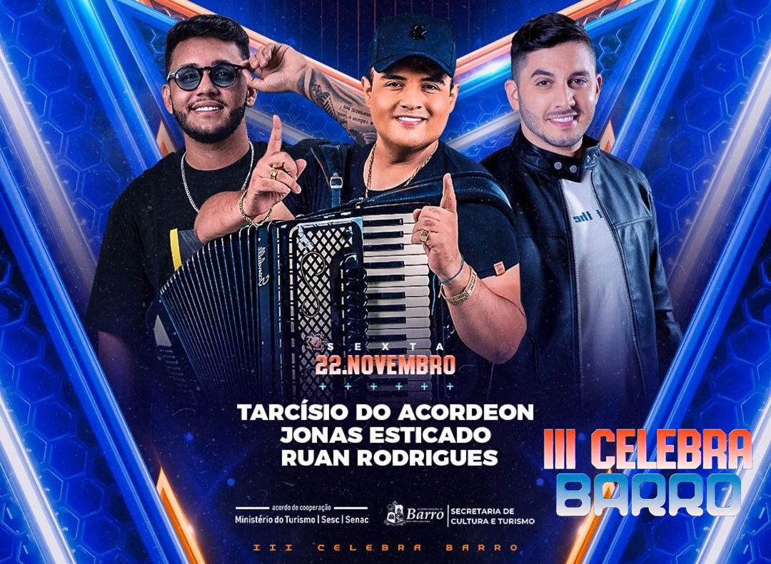 Celebra Barro 2024: Tarcísio do Acordeon, Jonas Esticado e Ruan Rodrigues se apresentam nesta sexta-feira